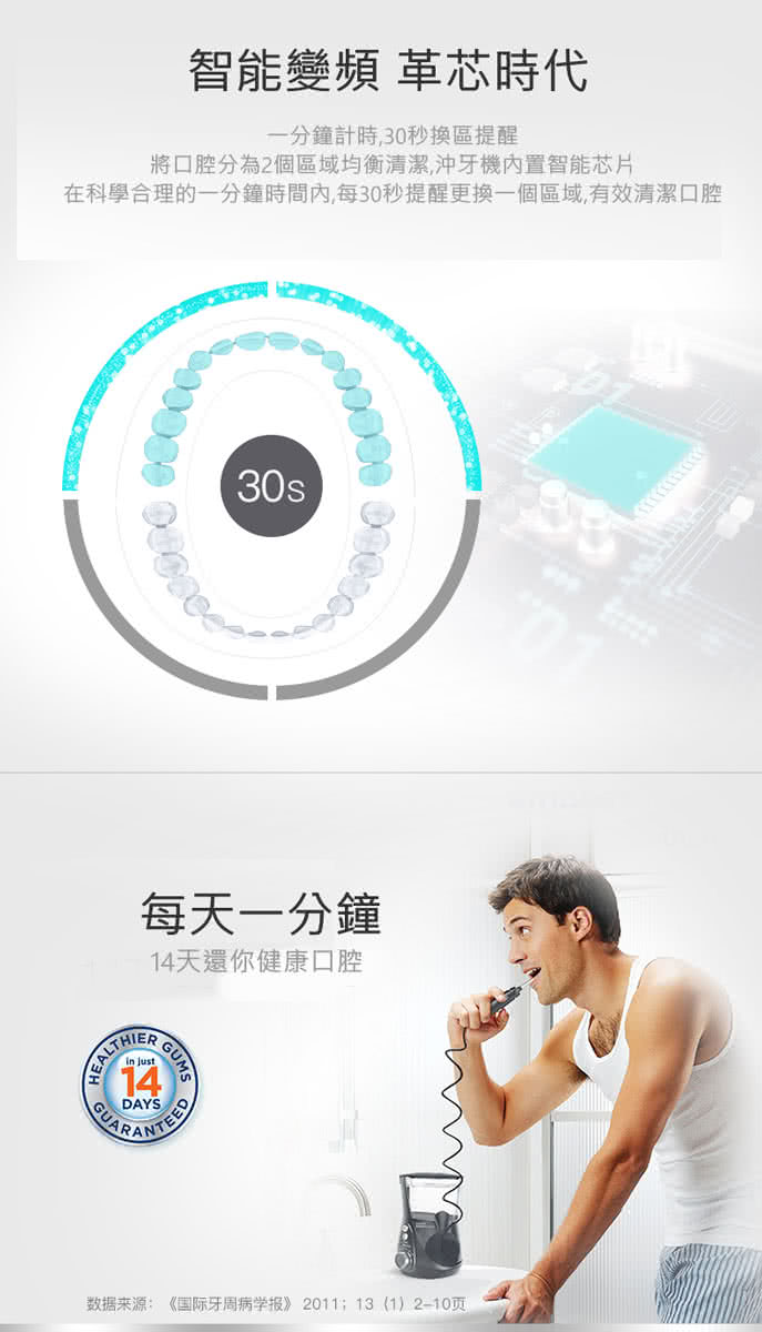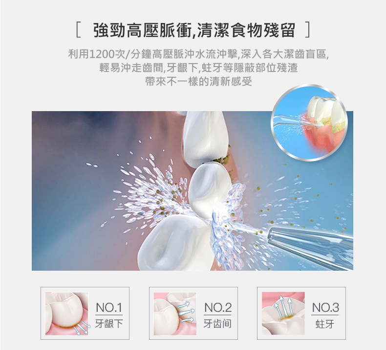 每分鐘 1400 下強勁且獨特的高壓脈衝水柱保證能深入清理牙齦以下和齒間部位.
